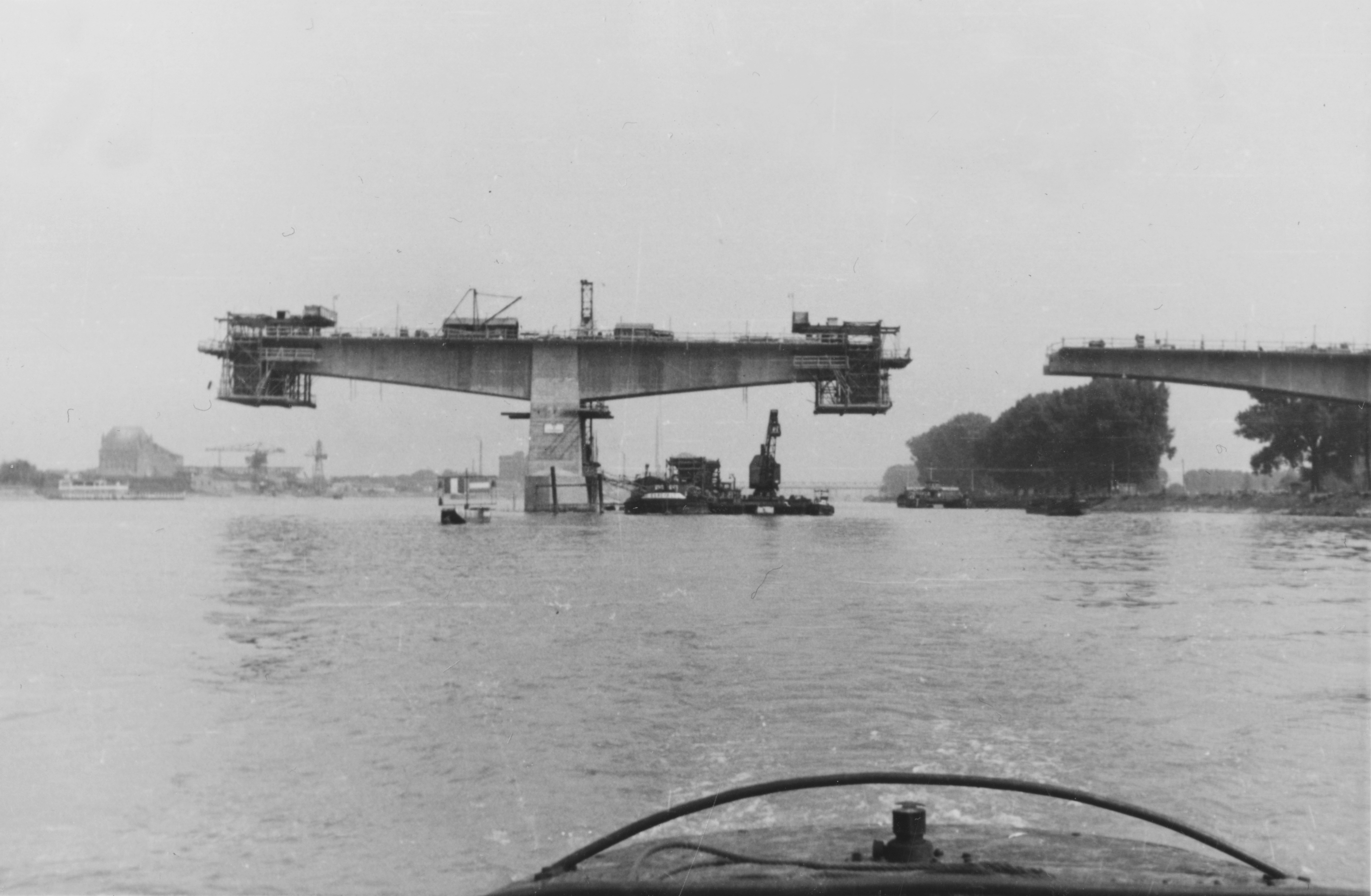 202012__Nibelungenbruecke_HistBABWS_01 November 30, 2020 3033 × 1982 Bau der Überbauten im freien Vorbau, Quelle: Historisches Bildarchiv der Bundeswasserstraßen