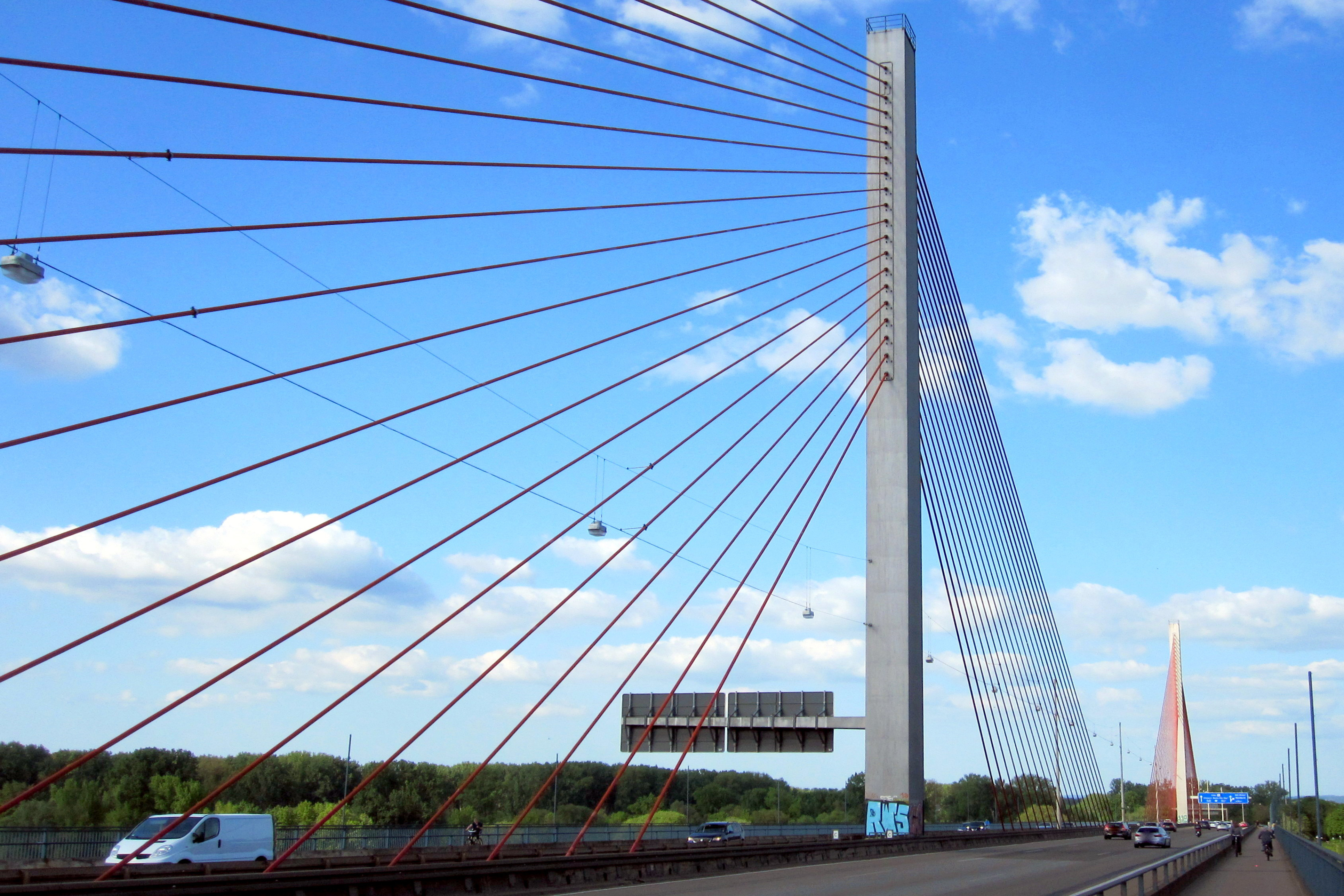 Bei der bautechnikgeschichtlich besonders bemerkenswerten Strombrücke handelt es sich um eine seilverspannte Mittelträgerbrücke mit an zwei Pylonen harfenartig angeordneten Abspannungen aus je 20 Seilen mit Durchmessern von 91 bis 123 mm. Ihr stählernes, rund 29 m breites Fahrbahndeck bildet ein verdrehsteifer Hohlkasten, der zur Oberseite mit einer weit auskragenden, orthotrope Platte abschließt. Den Rhein überwindet das Bauwerk mit einer Hauptöffnung von 280 m und zwei Seitenfeldern von je 120,1 m Spannweite. Mit den beidseitig anschließenden Vorlandbrücken in Spannbeton erreicht das Bauwerk eine Länge von knapp 1300 m. |