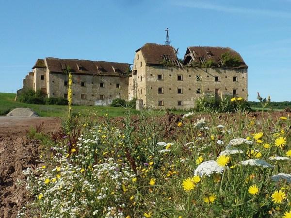 Die noch verbliebenen Gebäudeteile entstanden nach Plänen des berühmten Barockbaumeisters Balthasar Neumann im Zuge des Aufbaus eines Hofguts des Würzburger Fürstbischofs Friedrich Karl von Schönborn. Für landwirtschaftliche Nutzbauten weisen sie einige außergewöhnlich ausgestaltete Elemente auf. Dies gilt etwa für das durchgehendgewölbte Treppenhaus im Schüttbau, das einerseits Durchblicke in die Lagerräume ermöglicht und zugleich adeligen Repräsentationsanspruch widerspiegelt. Technisch anspruchsvoll sind wiederum die massiven Gewölbe in sämtlichen Lagergeschossen. Deren Tragfähigkeit erhöhen innerhalb der Gewölbemauerungen verlaufende Spannanker aus Schmiedeeisen, wodurch auf aussteifende Binnenstrukturen oder Strebepfeiler am Außenbau verzichtet werden konnte. Solcherart bewehrte Gewölbe sind aus bautechnikgeschichtlicher Sicht eine Rarität und kamen überdies nach derzeitigem Kenntnisstand hier zum ersten Mal zur Anwendung. Sie entstanden früher als bislang bereits bekannte Planungen zur Bewehrungseinlage in Mauerwerk für die Abteikirche von Neresheim (1759, nicht umgesetzt) von Baltasar Neumanns ältestem Sohn, Ignaz Franz Michael Neumann, oder als die berühmte Bewehrung im Pariser Panthéon nach Plänen von Jacques-Germain Soufflot (1764/90). Die Existenz der unsichtbaren Neumann’schen Anker geriet in Öttershausen allerdings anscheinend recht bald in Vergessenheit, denn im späten 19. Jahrhundert wurden die dortigen Gewölbe zwischen den Kämpferpunkten mit „traditionellen“ eisernen Spannankern verstärkt. Auch das auf einem Kniestock aufliegende Dachtragwerk mit seinen Hängewerken und Kreuzstreben sowie seinen durch eiserne Bolzen gesicherten Verbindungen ist ein hervorragendes Beispiel für die Innovationskraft Balthasar Neumanns, in diesem Fall auf dem Gebiet der Fügetechnik im Holzbau. Durch den Einsatz von Kreuzstreben und Hängewerken konnte nämlich auf Zerrbalken verzichtet werden, wodurch auch in den Dachgeschossen die Lagerung von Getreideermöglicht wurde. Von Balthasar Neumann sind nur wenige erhaltene Nutzbauten bekannt. Unter diesen weist keiner eine vergleichbar komplexe und gleichzeitig repräsentative Ausgestaltung auf. Besonders augenfällig tritt Neumanns Ingenieurkönnen in der durchgehenden Wölbung hervor. Gleichzeitig lassen sich an dem Gebäudekomplex aber nahezu alle typischen Elemente Neumann’scher Architektur beispielhaft ablesen. |